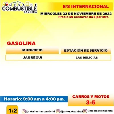 Inicio#CombustibleTachira 23 de noviembre Miercoles. Programación de E/S a precio internacional GASOLINA y DIESEL PorRedacción InfoRedTáchira —23 noviembre 0 Programación de E/S a precio internacional de GASOLINA y DIESEL para el suministro de combustible en el estado #TACHIRA ⛽ Miercoles 23 de noviembre